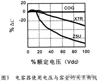 ①電容器的使用電壓對(duì)電容器的電容量有影響,穩(wěn)定性低的介質(zhì),在施加額定工作電壓后容量會(huì)大幅度下降(見圖3),以至達(dá)不到使用效果,這一點(diǎn)在選擇電容器時(shí)必須給以充分注意(不能一味追求大容量和小體積,必須在容量和使用電壓上留有充分余地)。