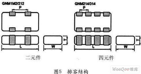 村田制作所還生產(chǎn)一種排容,在一個(gè)器件中有2至4個(gè)電容,尤其適合在單片機(jī)的總線上使用,見圖5。