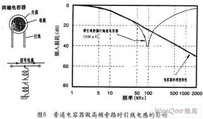 2)片式三端電容器   我們平常使用的陶瓷圓片電容器作為旁路電容,可以將高頻干擾短路到地,達(dá)到抗干擾的目的。但是電容器的引線電感及電容內(nèi)部的剩余電感卻限制了它的高頻特性發(fā)揮。圖6是普通電容器做高頻旁路時(shí)的引線電感影響例。
