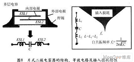 應(yīng)該說片式二端電容器的出現(xiàn)對(duì)于改進(jìn)普通引線式電容器的自諧振問題是很有好處的,因?yàn)槠蕉穗娙萜鞯囊€長度得到了最大限度縮減。但由于電容器內(nèi)部的構(gòu)造,并不能夠消除內(nèi)部電極的殘留電感,這樣當(dāng)頻率達(dá)到使電容器的容抗XC同殘留電感的XL的絕對(duì)值相等時(shí),二端電容依然會(huì)產(chǎn)生自諧振,參見圖8。由于自諧振頻率的存在,當(dāng)噪聲的頻帶超過自諧振頻率之后,噪聲的抑制效果會(huì)急速下降。但是與普通有引線的二端電容相比較,還是有很大改進(jìn)。