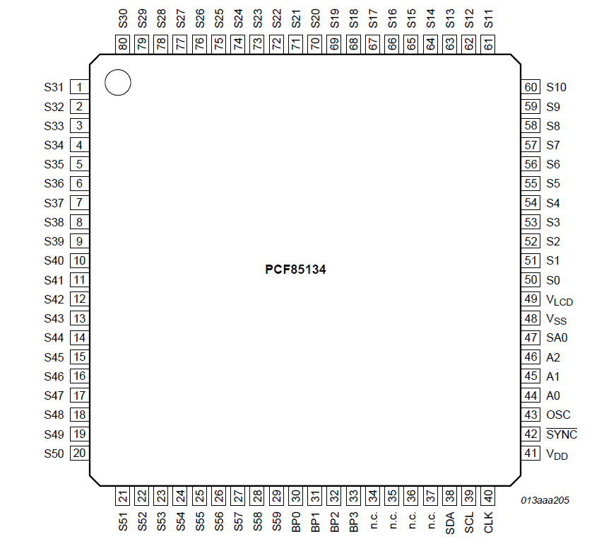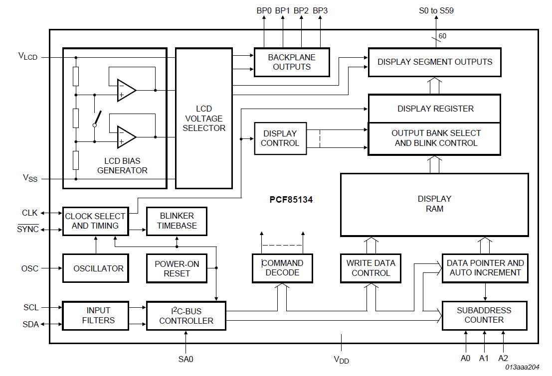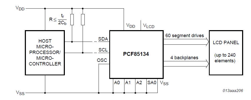 PCF85134是一個外圍設備,可與幾乎所有具有低復用率的液晶顯示器(LCD)1連接。它為任何靜態(tài)或多路復用的LCD生成驅動信號,其中包含多達四個背板和多達60個段。它可以很容易地級聯(lián)起來,用于更大的LCD應用。PCF85134與大多數(shù)微控制器兼容,通過雙線雙向I2C總線進行通信。通過帶有自動遞增尋址的顯示RAM、硬件子尋址和顯示存儲器切換(靜態(tài)和雙工驅動模式),通信開銷降到最低。2.特點和優(yōu)點? 單芯片LCD控制器和驅動器? 可選擇的背板驅動配置:靜態(tài)、2、3或4背板復用? 60段輸出允許驅動:?30 7段字母數(shù)字字符?15 14段字母數(shù)字字符?任何高達240元素的圖形? 支持大型應用的級聯(lián)? 60 ? 4位顯示數(shù)據(jù)存儲RAM? 寬廣的LCD供應范圍:從2. 5 V,用于低閾值LCD,直到6.5 V,用于高閾值的雙絞線LCD? 帶有電壓跟隨器緩沖器的內(nèi)部LCD偏置生成? 可選擇的顯示偏置配置:靜態(tài)、1/2或1/3? 廣泛的邏輯電源范圍:從1.8 V到5.5 V? LCD和邏輯電源可以分開? 低功耗? 400 kHz I2C總線接口? 無需外部元件? 在靜態(tài)和雙工驅動模式下顯示存儲器組切換? 多功能的閃爍模式? 硅門CMOS工藝。