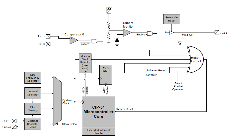 八個復位源可用:上電復位電路(POR),片上VDD監(jiān)視器(當電源電壓低于VRST時強制復位,如第134頁表12.1所示),看門狗定時器,缺失時鐘檢測器,比較器0的電壓水平檢測,強制軟件復位,外部復位引腳,以及非法閃存訪問保護電路。除了POR、復位輸入引腳或閃存錯誤外,每個復位源都可以由用戶在軟件中禁用。在MCU初始化過程中上電復位后,WDT可以在軟件中永久啟用。